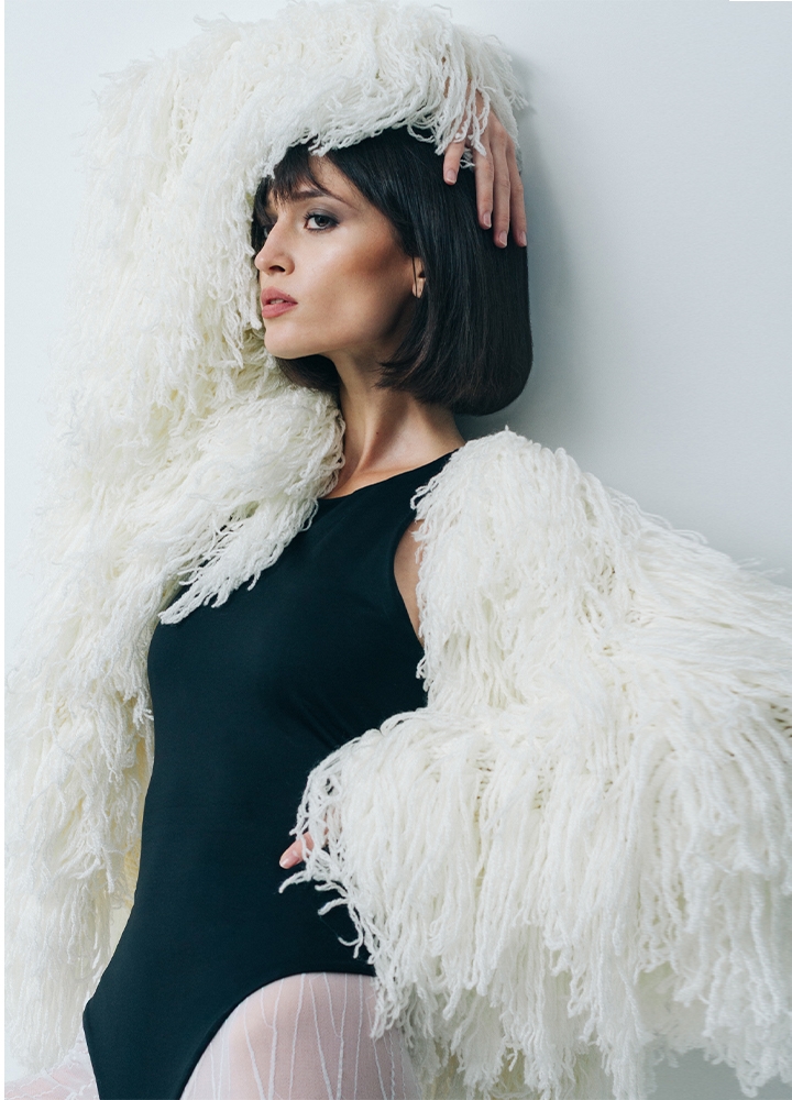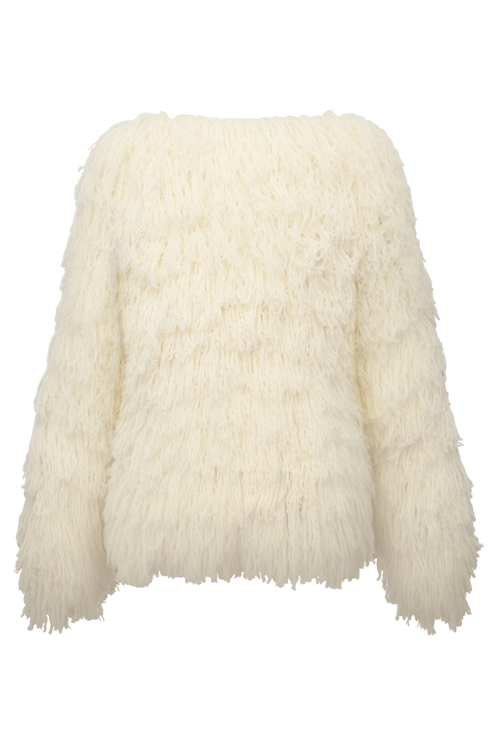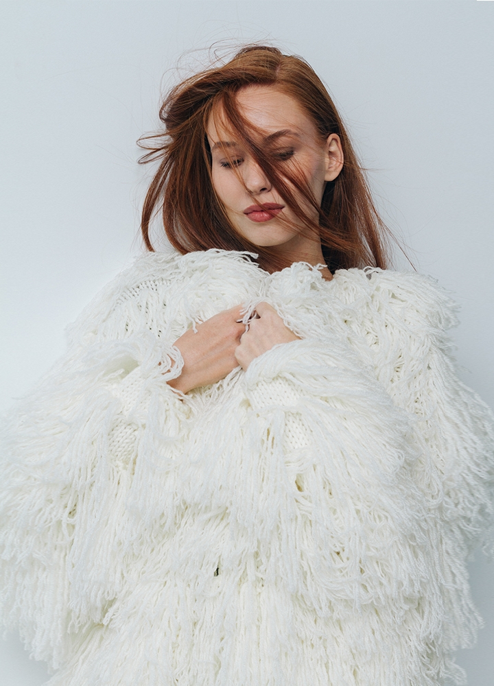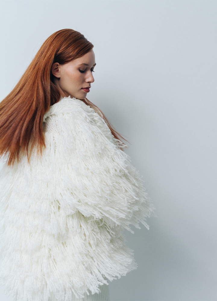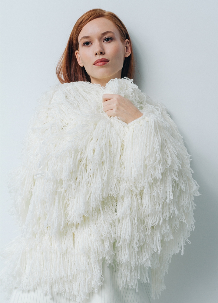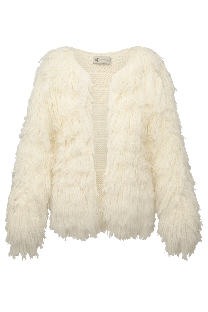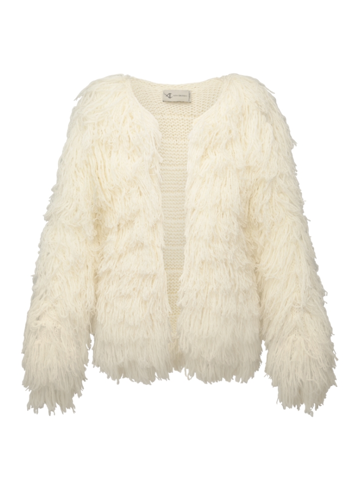 Jacheta alba din lana cu maneci tricotata manual Halo