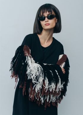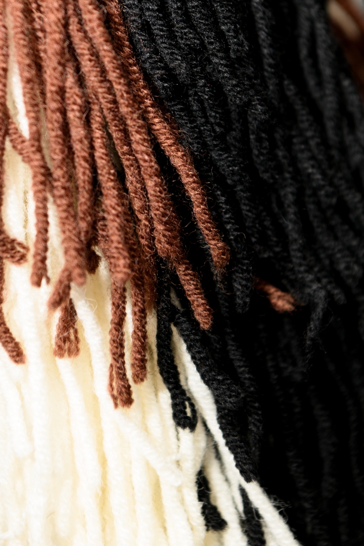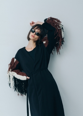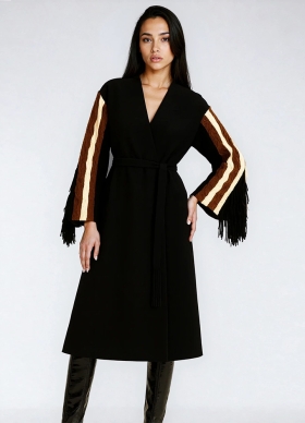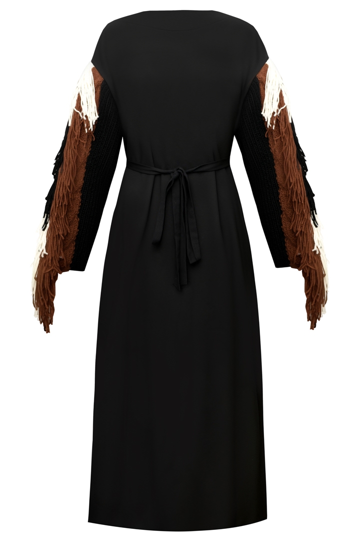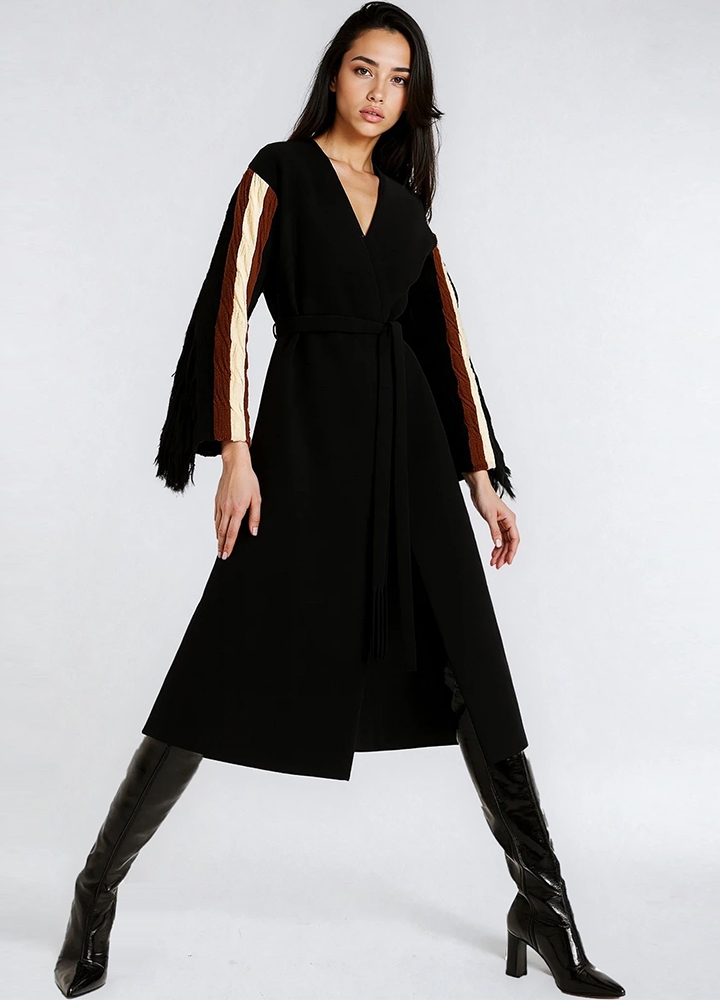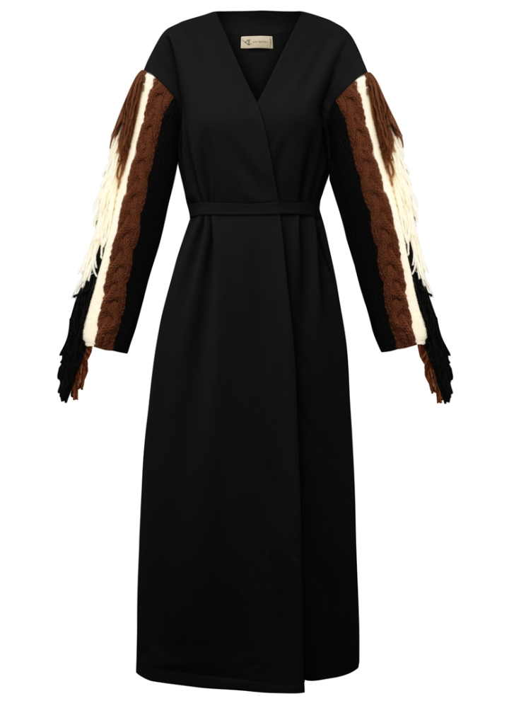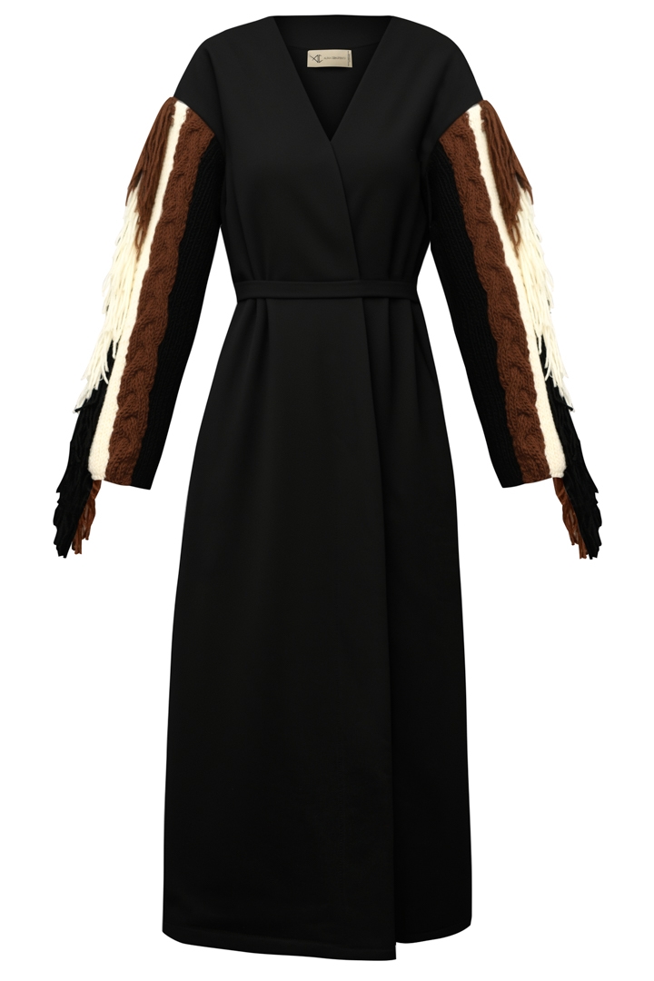 Palton lung negru si maro din bumbac flausat cu maneci tricotate manual din lana si buzunare Totem