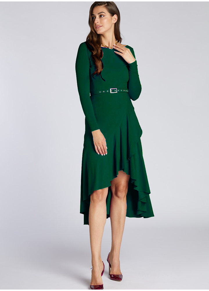 Rochie asimetrica verde cu volane cu spate decoltat si curea asortata Mimosa