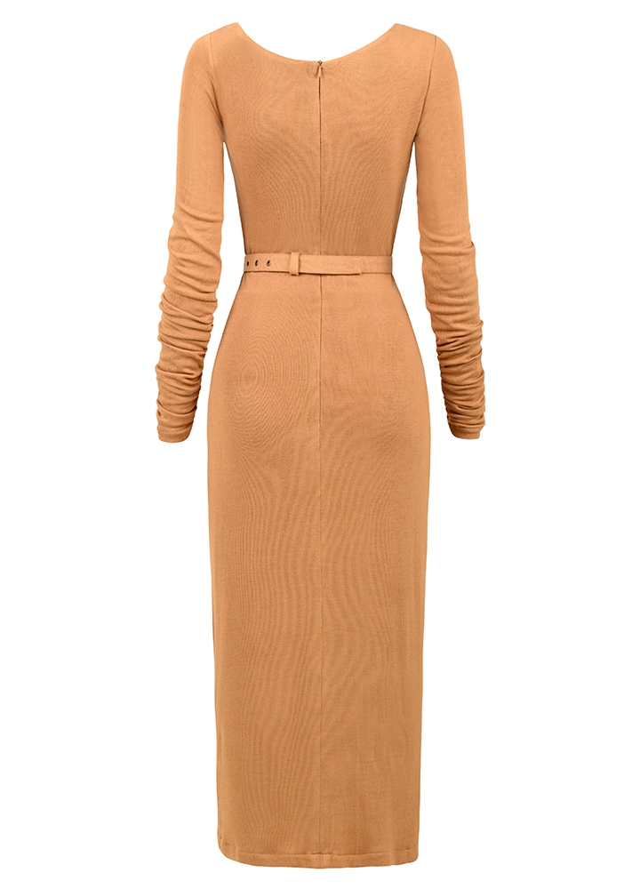 Rochie bodycon crem din modal si bambus cu drapaje si curea asortata Zaya