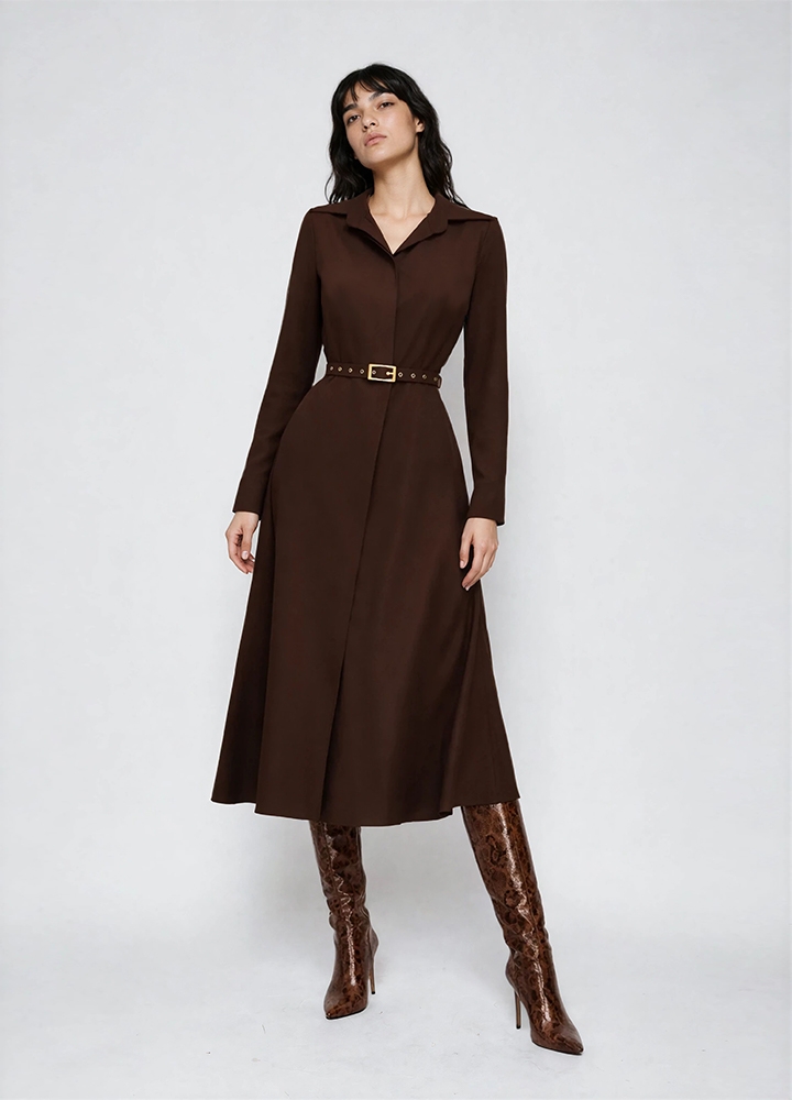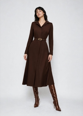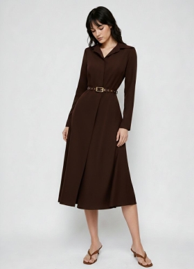Rochie camasa maro midi din viscoza cu maneci lungi si curea textila Sylvie