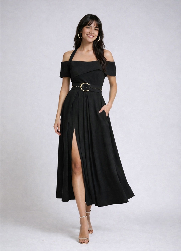 Rochie cocktail midi neagra din in cu decolteu cu bretele dupa gat Chimera