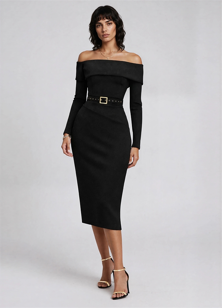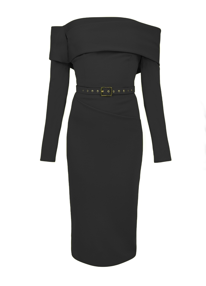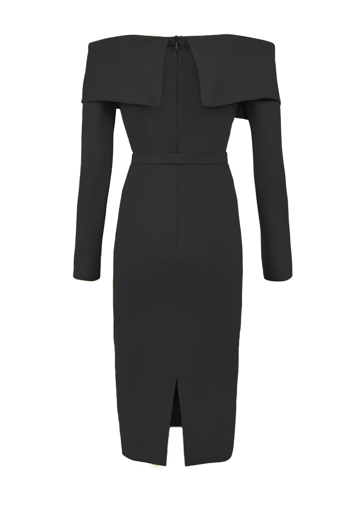 Rochie cocktail midi neagra din lyocell cu decolteu pe umeri Calliope