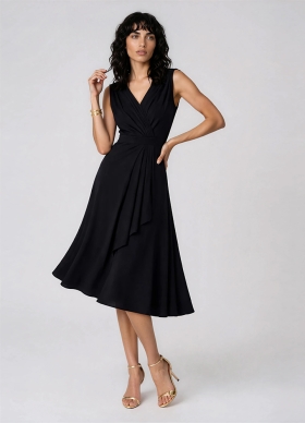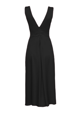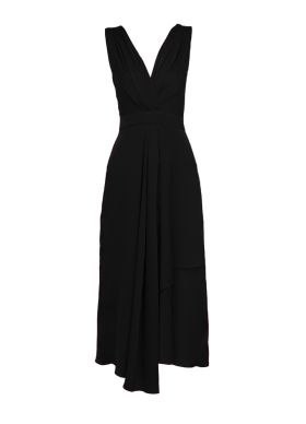 Rochie cocktail midi neagra din matase naturala cu decolteu in V si drapaje Rumba
