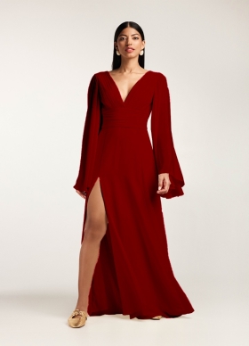 Rochie de seara lunga din matase naturala cu drapaje slit pe picior si maneci lungi Luz
