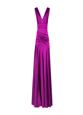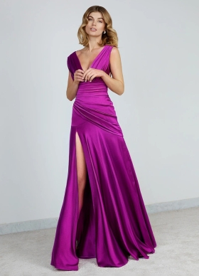 Rochie lunga de seara mov din matase cu decolteu in V si drapaje Hera