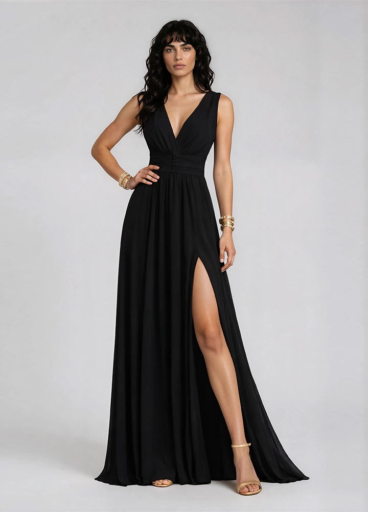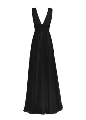 Rochie lunga de seara neagra din voal de matase cu drapaje si decolteu in V Poema