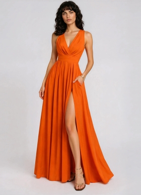 Rochie lunga portocalie din in si bambus cu drapaje si decolteu in V Winona