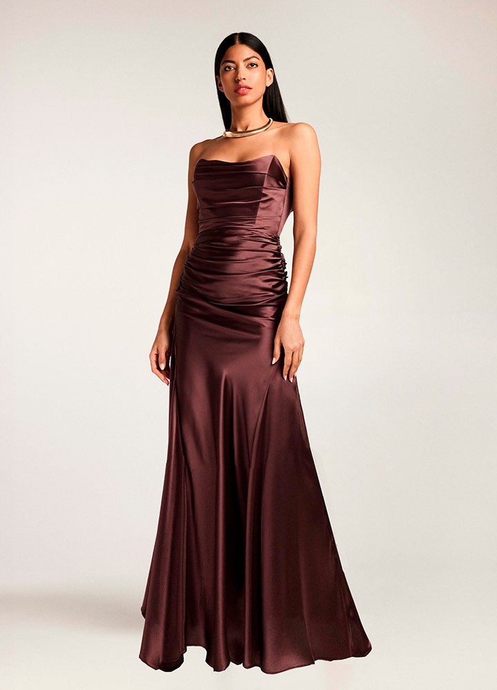 Rochie maro lunga din matase satinata cu drapaje si corset ajustabil Cassara