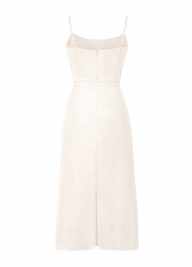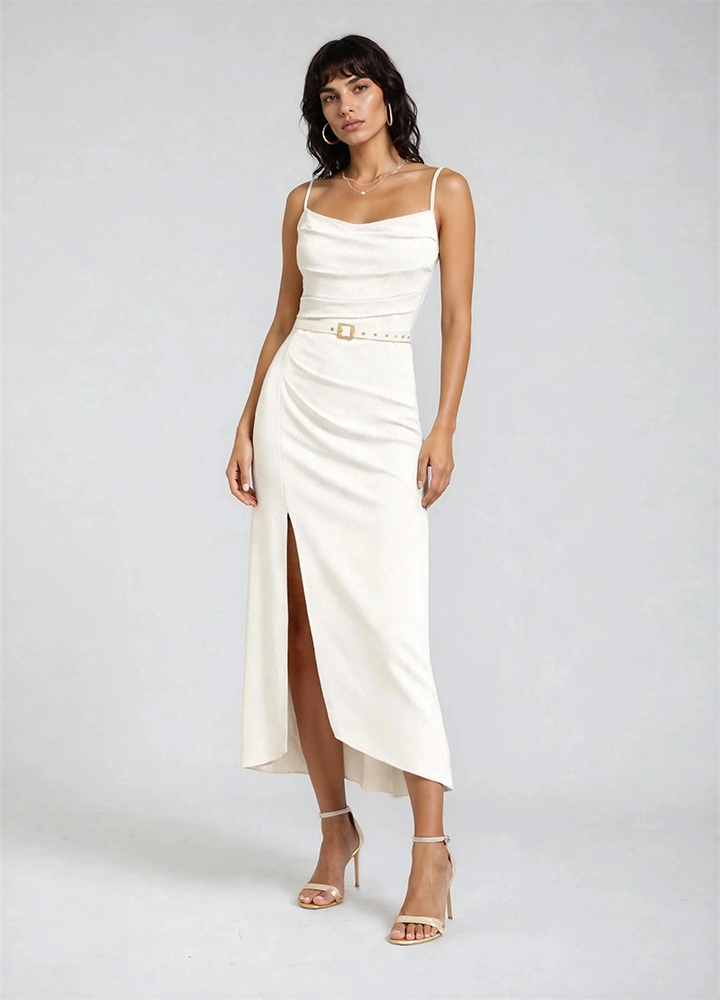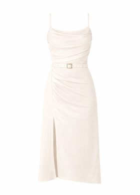 Rochie midi alba din lyocell cu drapaje si curea asortata Hecate