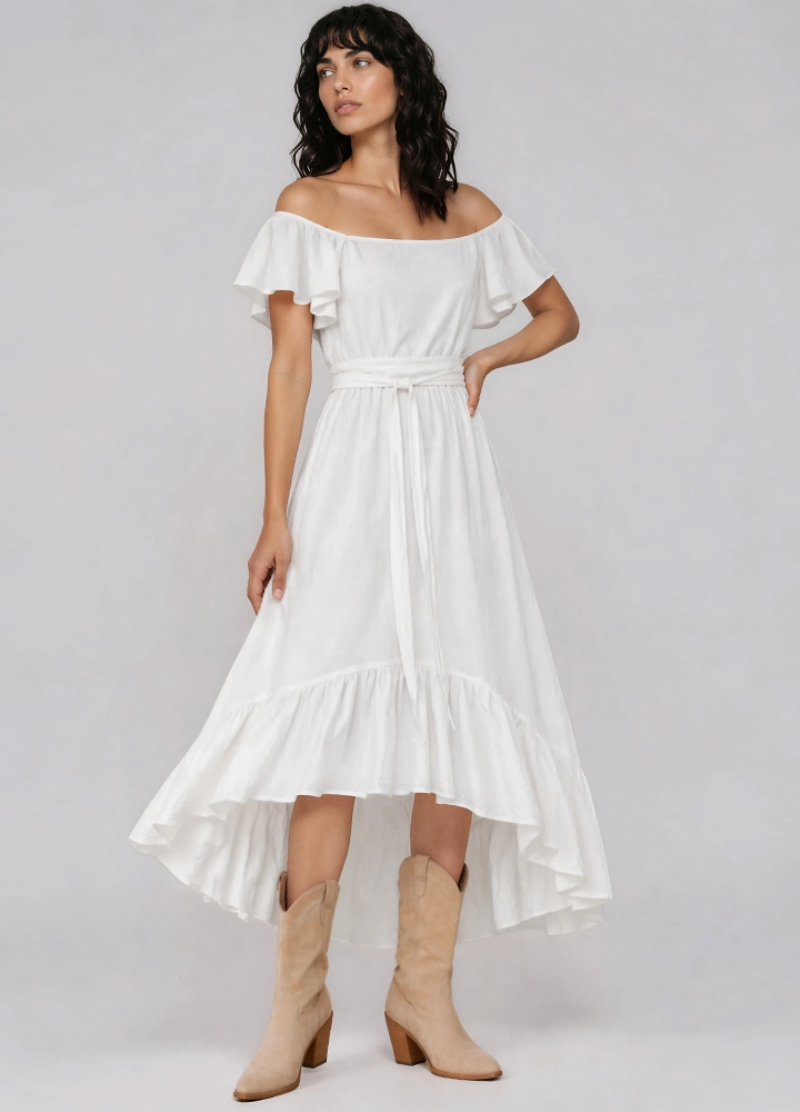 Rochie midi alba din panza topita bumbac cu decolteu pe umeri si fusta cu volan Palermo