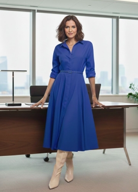 Rochie midi albastra din vascoza tip camasa cu maneci lungi si curea asortata Vera