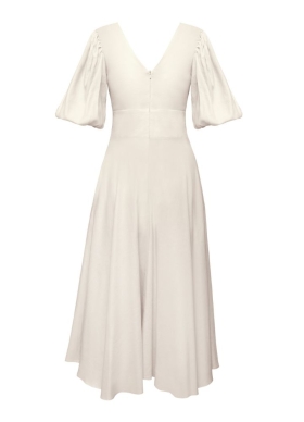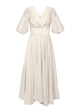 Rochie midi bej din in cu drapaje si maneci bufante Swan