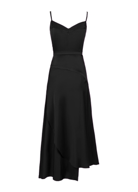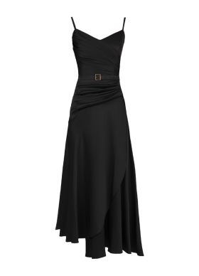 Rochie midi cocktail neagra din matase cu decolteu in V si drapaje Lyre