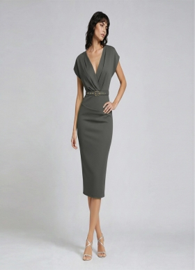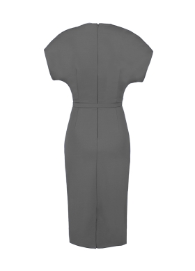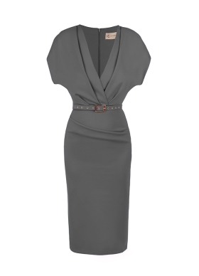 Rochie midi conica gri din vascoza cu decolteu in V si curea asortata Swift