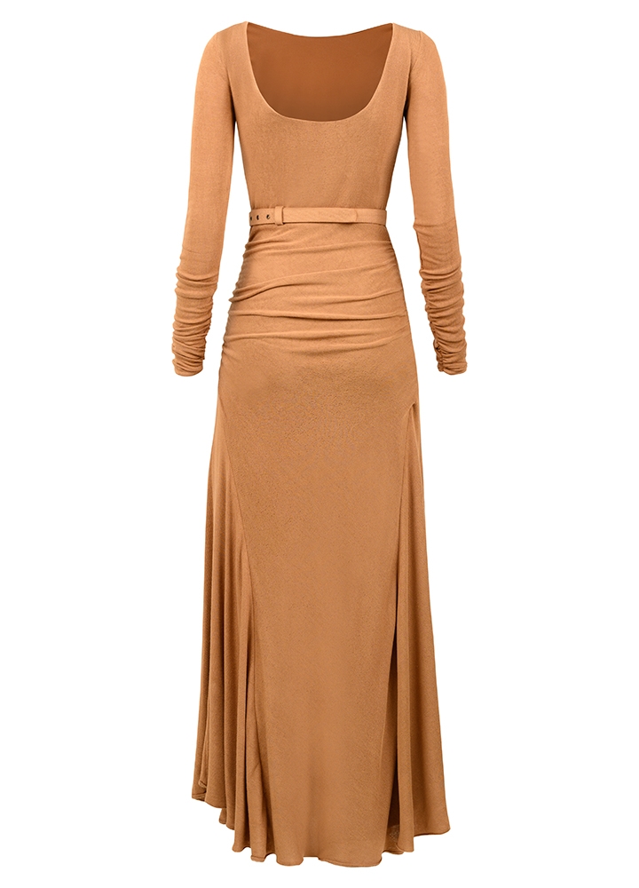 Rochie midi crem din modal si bambus cu drapaje si maneci lungi Shia