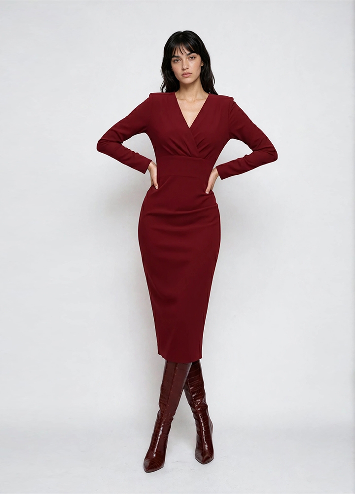 Rochie midi grena din tricot maneci lungi si decolteu in V Selin