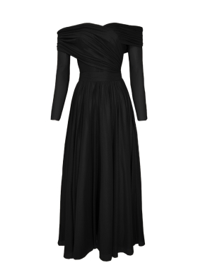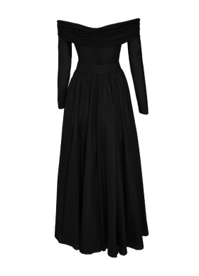 Rochie midi neagra din matase cu drapaje si decolteu pe umeri Luce