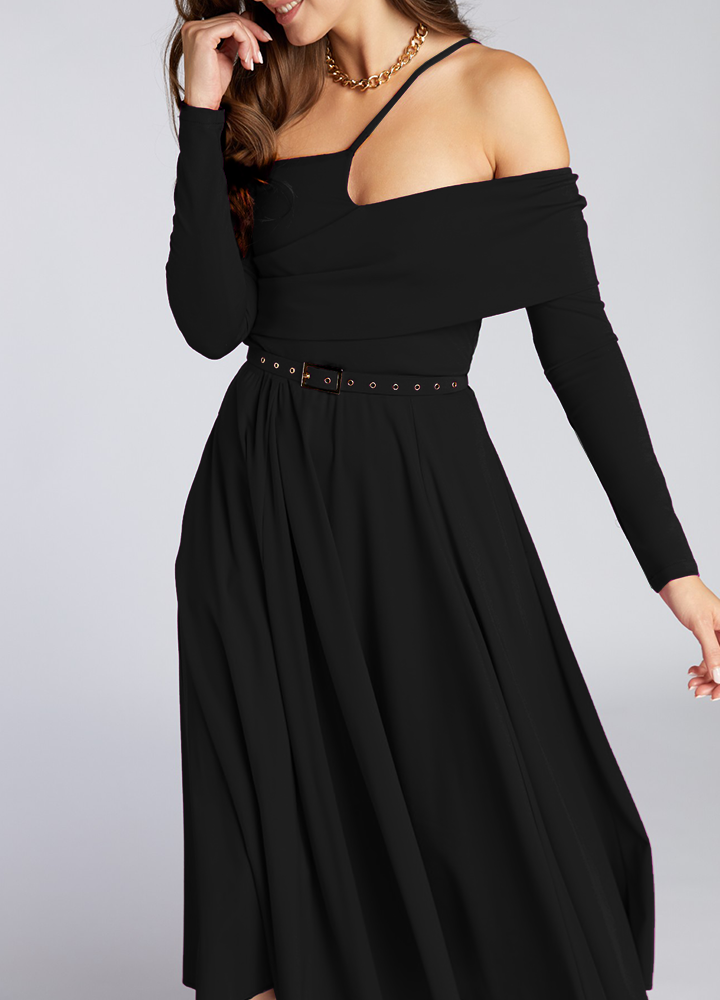 Rochie midi negru cu decolteu pe umeri si croiala evazata cu curea asortata Cinzano