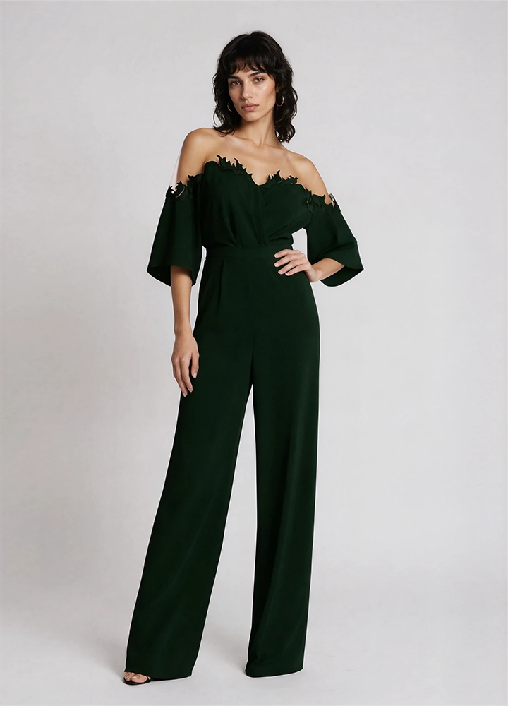 Salopeta cocktail lunga neagra cu pantalon evazat si decolteu in V cu broderii Zora