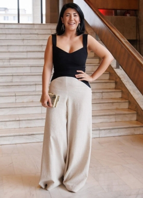 Set crem si negru din in cu bumbac texturat format din doua piese: top corset cu bretele si pantaloni lungi cu talie inalta evazati Doha