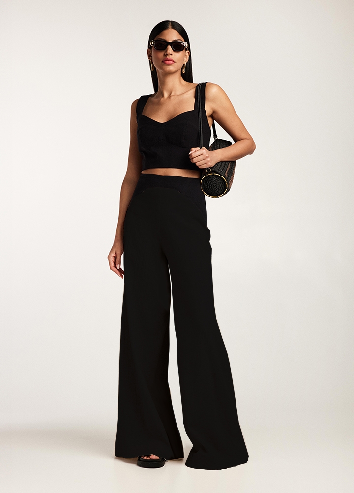 Set negru din in cu bumbac texturat format din doua piese: top corset cu bretele si pantaloni lungi cu talie inalta evazati Doha