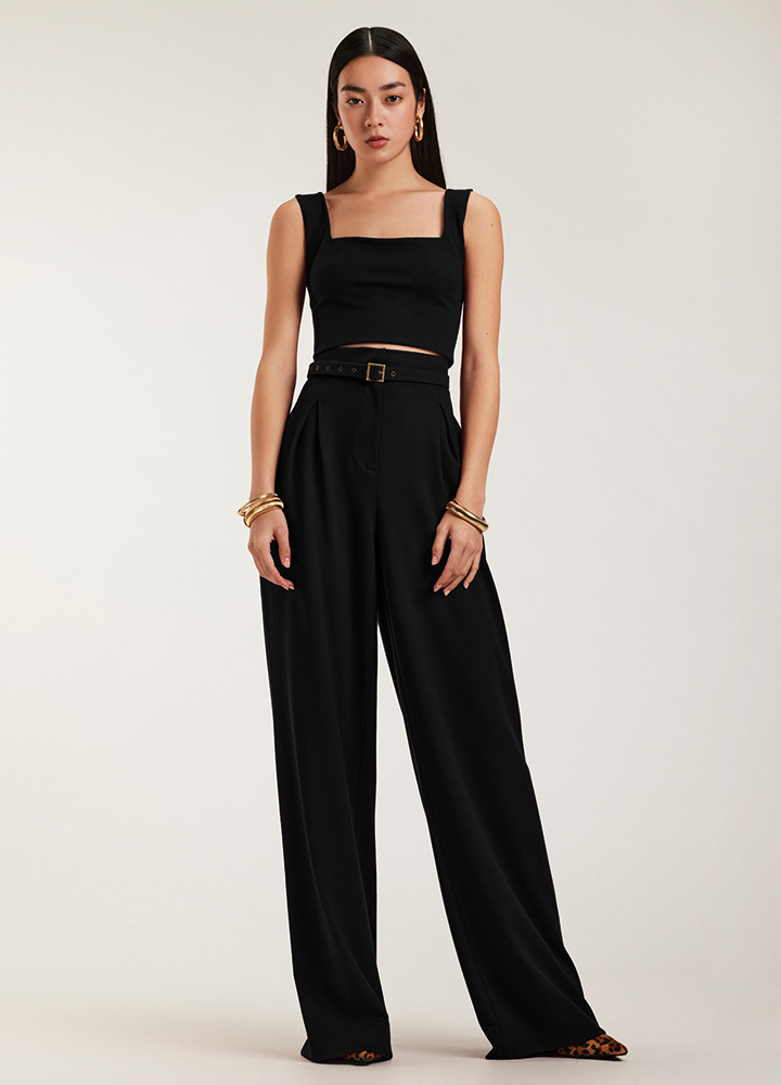 Set negru din tricot format din DOUA piese: top cu bretele si pantaloni drepti cu pense Pinot